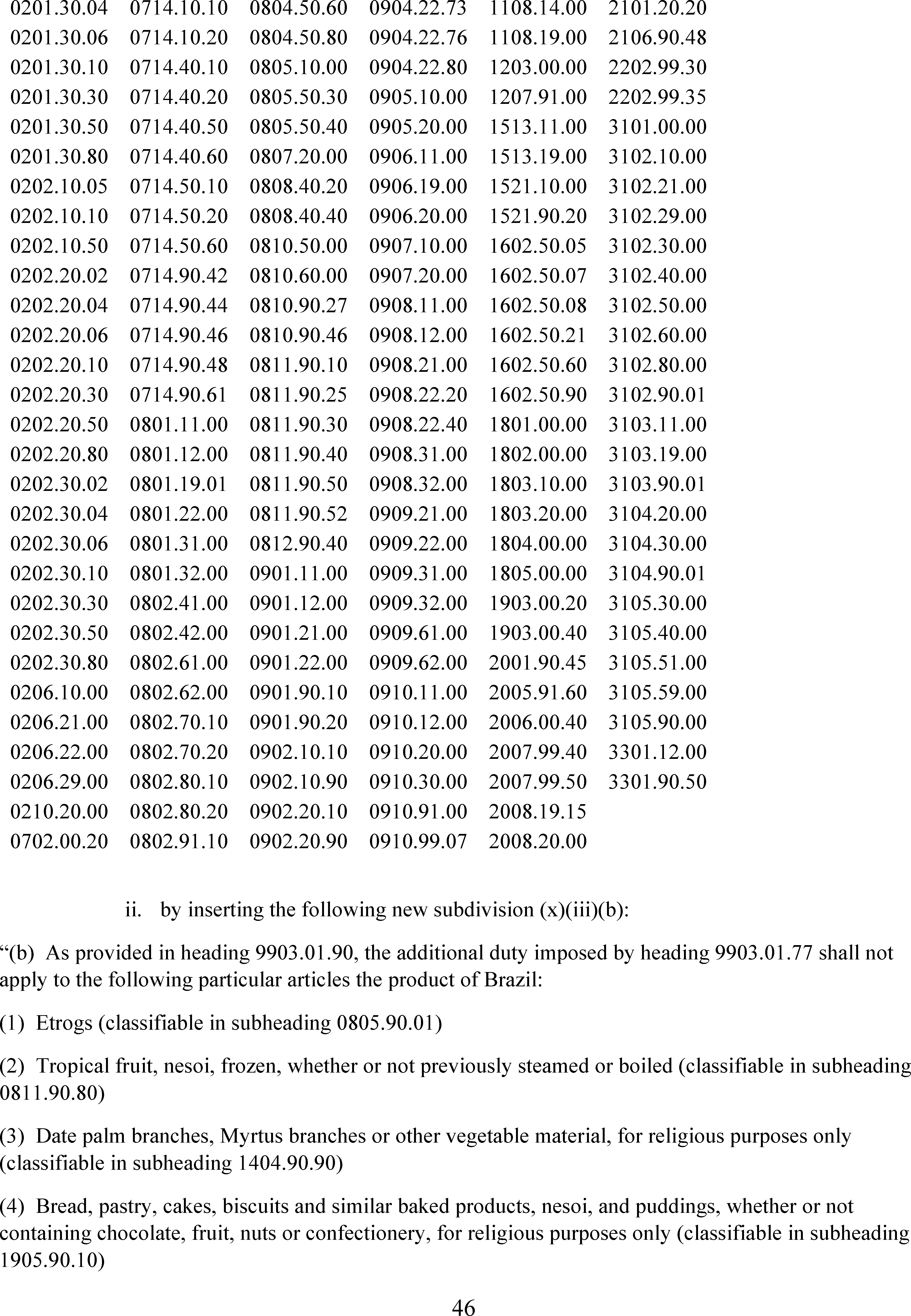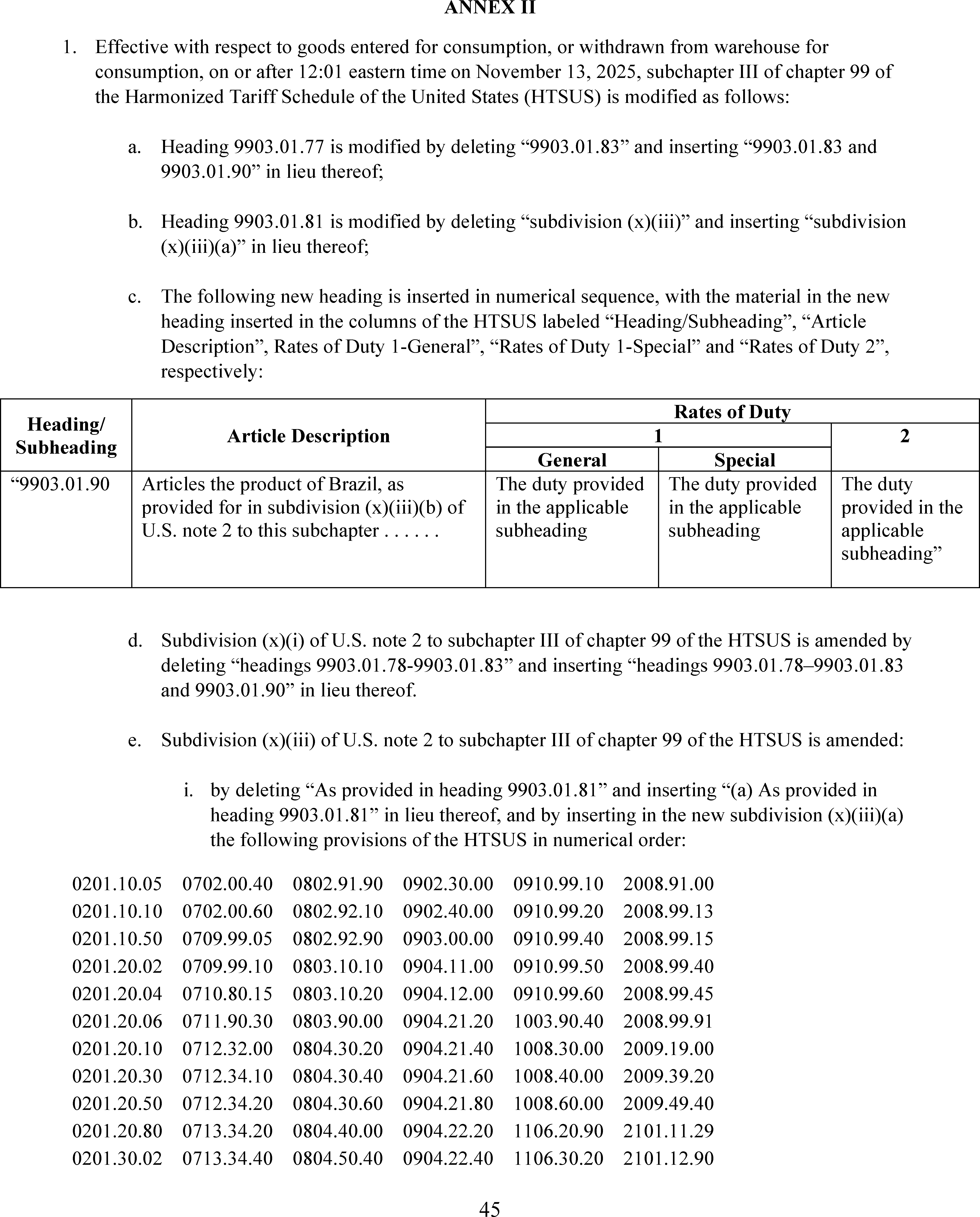 After considering the information and recommendations these officials have provided to me and the status of negotiations with the Government of Brazil, among other things, I have determined that it is necessary and appropriate to modify the scope of products subject to the additional ad valorem rate of duty imposed under Executive Order 14323. Specifically, I have determined that certain agricultural products shall not be subject to the additional ad valorem rate of duty imposed under Executive Order 14323. Accordingly, an updated version of Annex I to Executive Order 14323 is attached to this order, which shall be effective with respect to goods entered for consumption, or withdrawn from warehouse for consumption, on or after 12:01 a.m. eastern standard time on November 13, 2025. In my judgment, these modifications are necessary and appropriate to deal with the national emergency declared in Executive Order 14323.